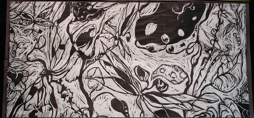Poem by Peter Everwine; twelve-page woodcut by Bill Kelly on Seichosen and Twinrocker papers. Text hand-set in Bembo and printed letterpress by Nelle Martin. Woodcut printed by the artist. Leporello binding in hand painted paper over boards and Twinrocker Walnut paper, housed in a silk-covered clamshell box made by Sonja Jones. 6 7/8" x 25 3/4". Edition of 35. 2005.
