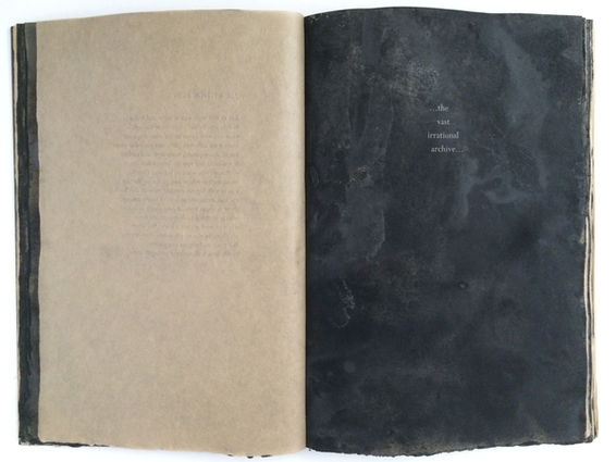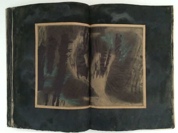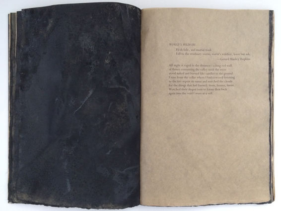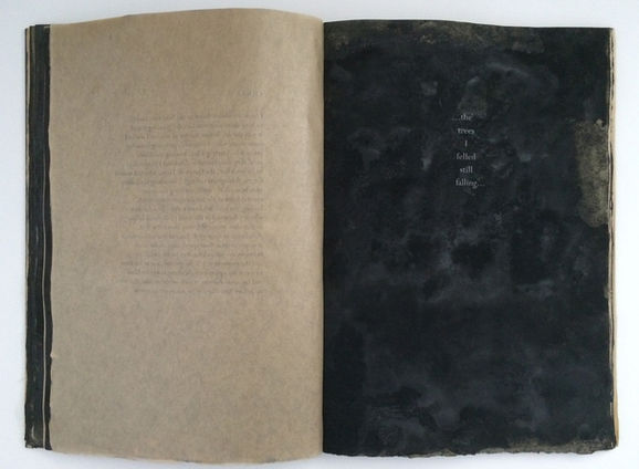 Michele Burgess writes: “I asked Chard how he felt about the idea of ‘night’ as an archive of thought. He sent me these poems. After reading them I thought about and drew shafts of moonlight and sunlight in the woods of Vermont. Chard had recently and reluctantly cut down 100 trees to protect his house from falling limbs and to create a meadow on his property. This seemed a very dramatic event to me, as a woman from the arid southwest, and I was captured by the duality expressed in it. I used those trees as metaphors for his poems to explore the way darkness orients and reorients itself in nature and in the human imagination. The paintings felt necessary to add physicality to the blackness and to enclose the etchings.” This is volume seven of Burgess's series, "The Stratigraphic Archives."