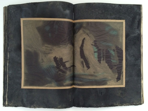 Eleven poems by Chard deNiord; eleven etchings and paintings by Michele Burgess. Text hand set in Perpetua and printed letterpress by Nelle Martin on Gampi paper. Etchings printed in two colors on Gampi by the artist. Paintings in gouache on Twinrocker paper. Bound in leather and painted paper by Lisa Van Pelt. Housed in a clamshell box made by Sonja Jones and covered in hand woven cotton from Guatemala. 11 3/4" x 8 3/8". Edition of 30. 2015.